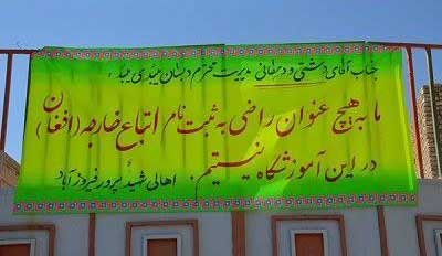 این پارچه را اهالی شهید پرور فیروزآباد نوشته و زدهاند بالای سر در مدرسهای در میبد. اهالی شهید پرور فیروزآباد که لابد آنقدر سرگرم پرورش شهید بودهاند در این سالها که اخلاق و شرافت انسانی را به کل فراموش کردند. این را نوشتهاند و زدهاند بالای سر در مدرسهی ابتداییای، تا اگر بچهی افغانیای توانست از هزار خوان فقر و بدبختی و فلاکتهای مهاجرت عبور کند و پایش به مدرسه برسد، بداند که همیشه باید مانند تولهسگ باران خوردهای در گوشه خفت کند و یادش نرود که با بقیه فرق دارد. یادش باشد که مردم شهید پرور فیروزآباد و آقایان دشتی و دهقانی لطف کردند و به او که سهمی از کرامت انسانی و حقوق اولیهی زندگی ندارد، تکهی ناچیزی از همین حقوق ساده و بدیهی را صدقه دادهاند.